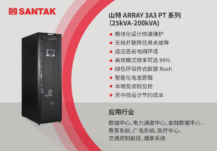 山特 ARRAY 3A3 PT 系列 25kVA-200kVA UPS,是山特新型的三进三出模块化 UPS,采用智能热插拔技术,集模块化设计、高效节能、锂电储能技术、灵活扩展及便捷安装为一体,通过智能无线并联技术可水平扩展至 800kW,可为电力调度中心提供稳定、可靠的电力保障。