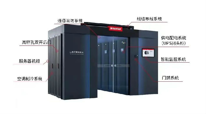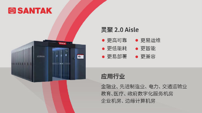 山特灵聚 2.0 Aisle 微模块数据中心解决方案,以多个机柜为基本单位,集供配电系统、高效制冷系统、智能化监控系统及物理基础设施于一体,基于通道设计,采用模块化等先进技术,在显著提升方案高可靠性的基础上,具备更低能耗、易部署、易扩展、易运维等多种优势,可满足电力用户机房建设的高标准要求,保障其各项业务顺利开展。